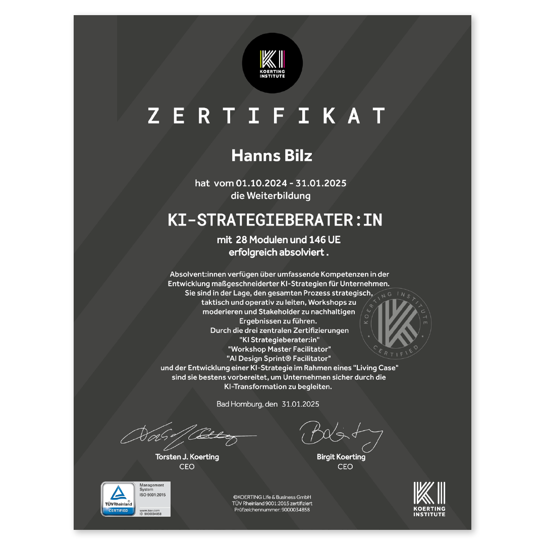 Zertifizierte Weiterbildung mit Schwerpunkt auf der Entwicklung und Umsetzung maßgeschneiderter KI-Strategien für Unternehmen.